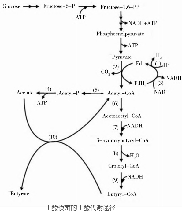 丁酸梭菌以葡萄糖為底物的發(fā)酵過程中,通過糖酵解途徑生成 3-磷酸甘油醛,再生成丙酮酸,丙酮酸在鐵蛋白氧化還原酶的作用下生成乙酰輔酶 A,生成乙酰輔酶 A 后,丁酸梭菌會根據(jù)自己生長需求的不同代謝產(chǎn)生不同產(chǎn)物,一種是生成丁酸,一種是生成乙酸[1]。